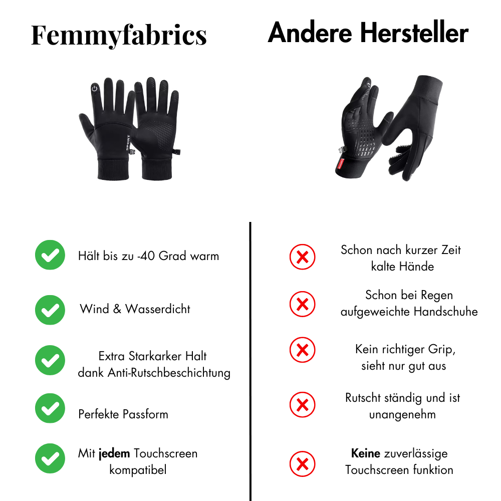 Femmy's Thermohandschuhe bieten zuverlässigen Schutz bis -40°C, sind komplett wind- und wasserdicht und lassen sich problemlos auf Touchscreens verwenden. Ihre ultra-rutschfesten Griffflächen und das weiche Futter machen sie funktionaler und komfortabler als herkömmliche Handschuhe.
