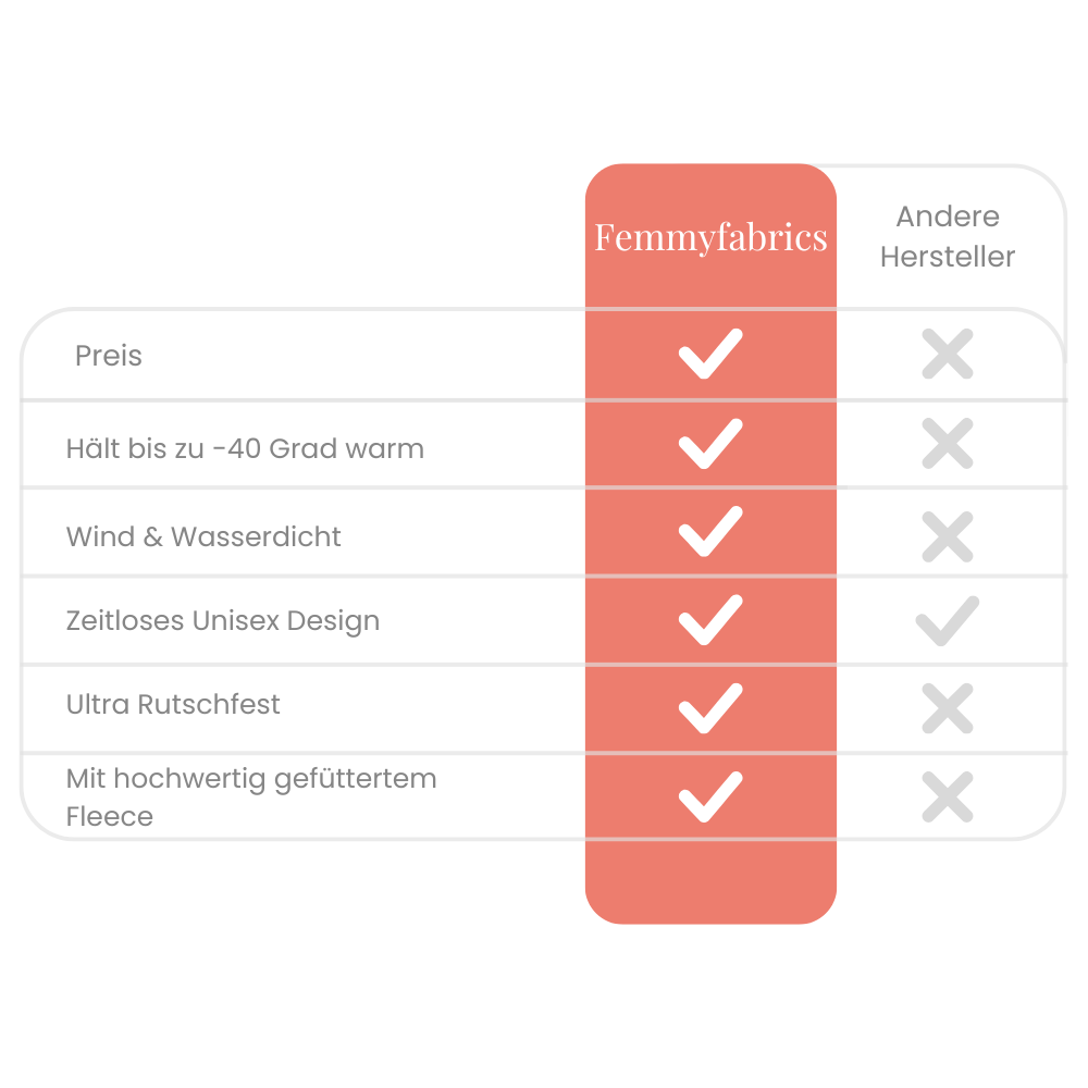 Unsere Handschuhe übertreffen die Konkurrenz durch überlegene Materialqualität, außergewöhnliche Wärmeleistung und eine perfekte Passform. Während andere Modelle oft schnell verschleißen und in den Funktionen versagen.