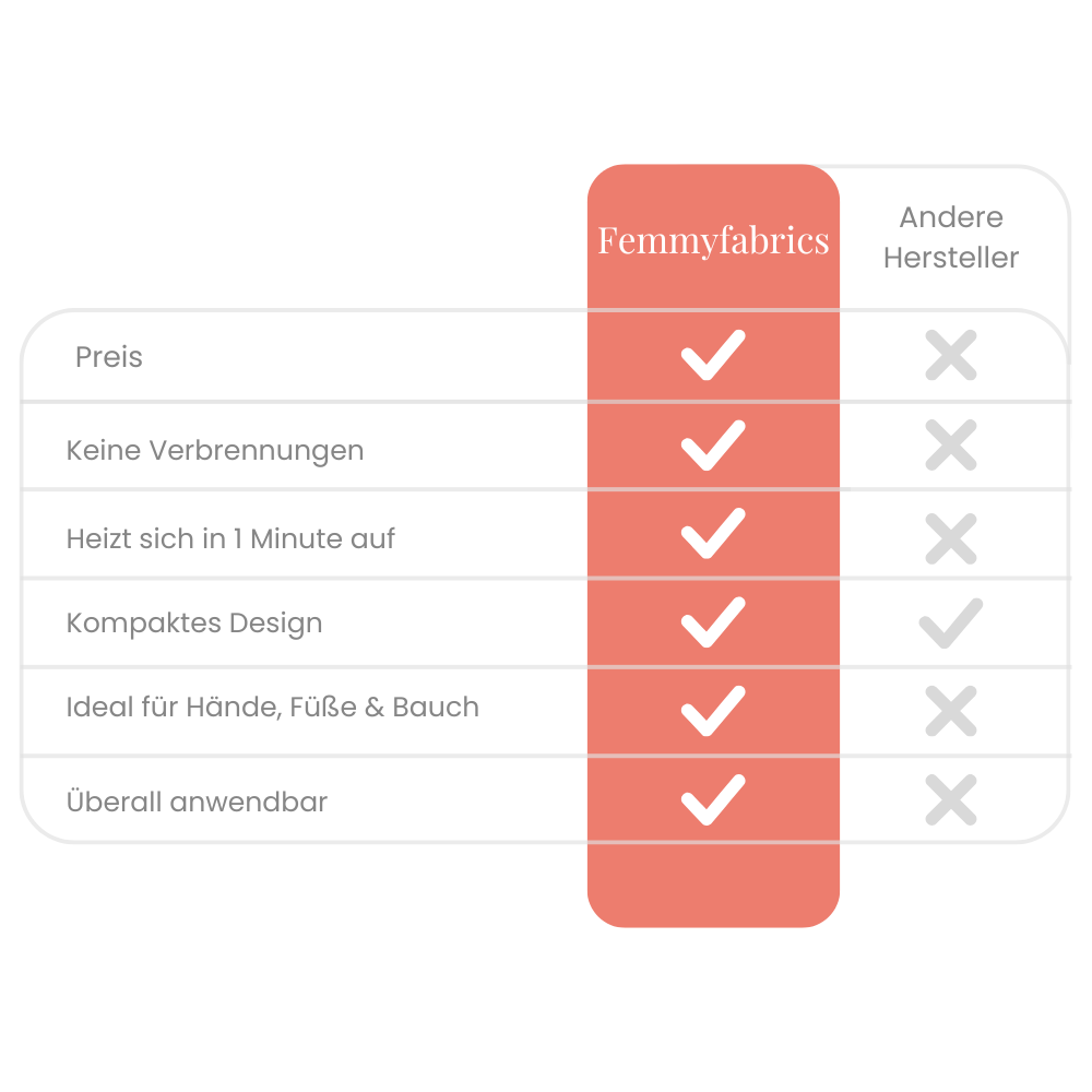 Das Femmy's Wärmekissen wird nie zu heiß, dank präziser Temperaturregelung und automatischer Abschaltung. Keine Verbrennungsgefahr, gleichmäßige Wärme und hautfreundliches Material – die smarte Alternative!